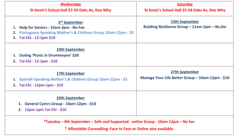 September Activity Calendar Call Jenny - 1300 372 224 enquire.nbmc@gmail.com